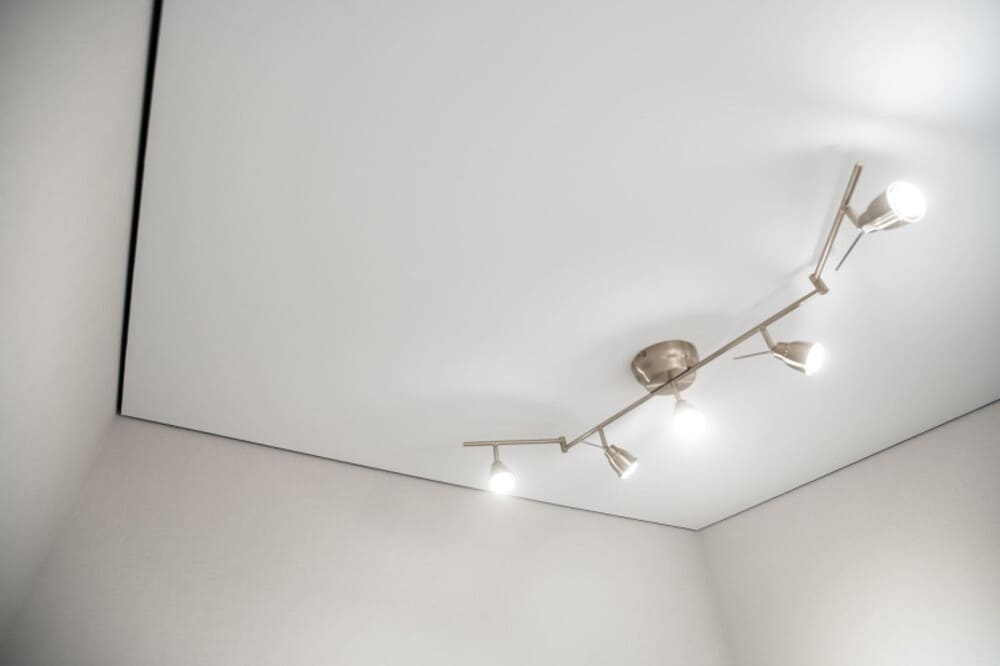 Также натяжное полотно позволяет встроить любую систему освещения, полностью маскируя провода. В случае необходимости произвести ремонт светового оборудования, полотно легко снять, а после завершения работ вернуть на место.